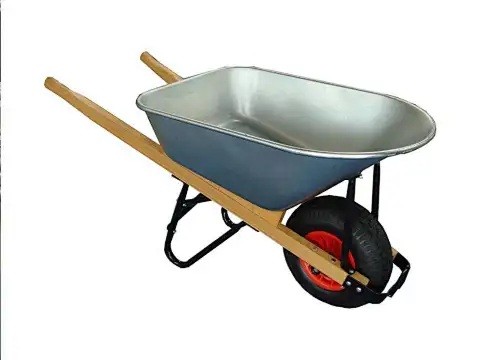 La carriola da cantiere è un utensile edile professionale in acciaio zincato con vasca in acciaio. È adatta per lavori di costruzione e ha una capacità di 100 litri. È dotata di una sola ruota con cerchi in acciaio.